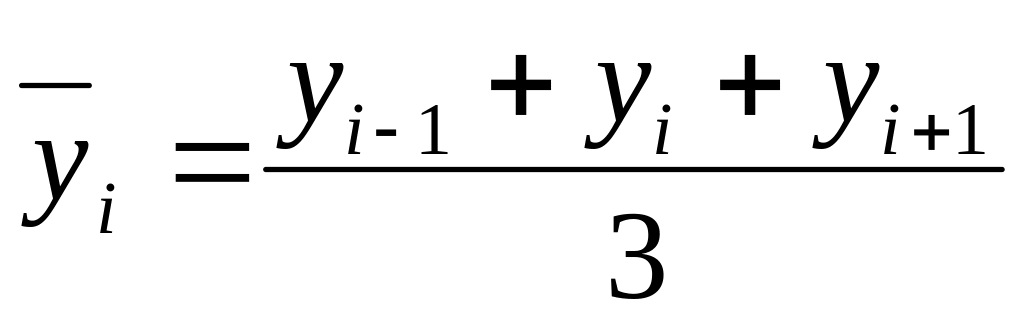 Период осреднения выбирается равным временному интервалу, в течение которого начинается и заканчивается цикл развития какого – либо явления. Исходные данные разбивают на группы (3, 4, 5), а затем просчитывают скользящие средние по формулам. При этом первый показатель отбрасывается, последний добавляется.