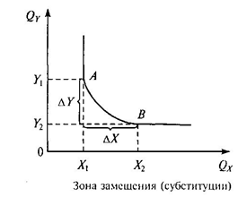 Кривая безразличия (U) состоит из точек, символизирующих наборы товаров Х и Y. Совокупные полезности всех наборов, представленные точками на этой кривой одинаковы, т. е. потребителю безразлично, какую именно комбинацию товаров Х и Y он приобретет. Переходя от точки А к точке В, потребитель сокращает потребление блага Y на ΔY и наращивает потребление товара X на ΔХ, но общий уровень удовлетворения потребителя (совокупная полезность) остается неизменным.