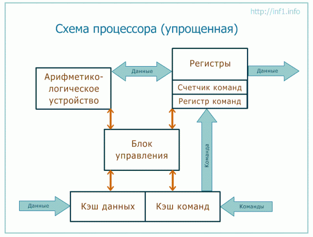 (Работа процессора сложнее, чем это изображено на схеме выше. Например, данные и команды попадают в кэш не сразу из оперативной памяти, а через блок предварительной выборки, который не изображен на схеме. Также не изображен декодирующий блок, осуществляющий преобразование данных и команд в двоичную форму, только после чего с ними может работать процессор.)
