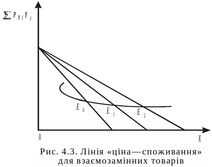 байдужості, визначають лінію «ціна—споживання». Вона показує, як реагує споживач на зміну ціни одного із благ. Різновид такого взаємозв’язку, в свою чергу, залежить від пов’язаності благ у споживанні. Для благ-замінників лінія «ціна—споживання» має від’ємний нахил, а для доповнюючих благ — додатний (рис. 4.3 і 4.4).