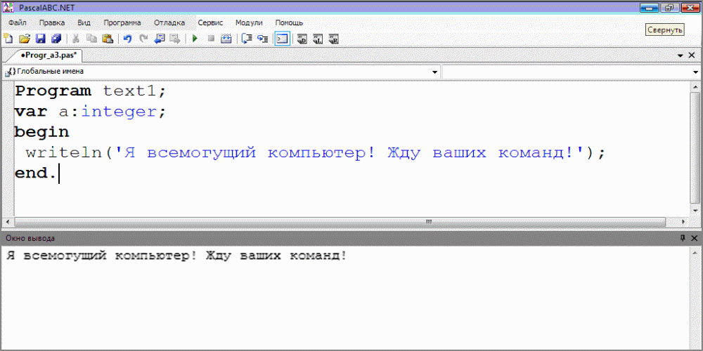writeln(’Я всемогущий компьютер! Жду ваших команд!’);