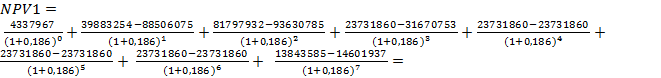 NPV 1 = -8 827 465-119495663+ 98484475,05+ 7142570,006+ 4651162,5+ 1162790,625+ 293234,8723+73308,71807= -16 515 587 р.