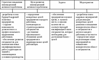 Соответственно изменение стратегических ориентиров развития предприятия влечет за собой изменение стратегии повышения инновационной активности работника и наоборот – качественные и количественные сдвиги в структуре персонала влекут за собой необходимость корректировки и внесения изменений в стратегические планы развития предприятия в целом.