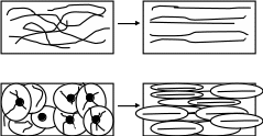 В промышленности ориентацию полим. изделий проводят путем одностороннего или двухстороннего растяжения, этот процесс называется вытяжкой. Под действием растягив. сил все элементы структуры трансформируются и ориентируются в направлении действия раст. сил. Ориентация происходит по двум основным механизмам: путем поворота вдоль оси ориентирования или в результате распада ранее образовавшихся упорядоченных областей и возникновения новых вдоль оси ориентации.