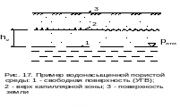 Свободная поверхность — это граница раздела между полностью водонасыщенной пористой средой и осушенной её частью (рис. 17). На этой границе давление равно атмосферному pатм . Особенностью является то, что над свободной поверхностью в пористой среде имеется капиллярная зона высотой hк , которая не полностью водонасыщена, но где часть влаги удерживается капиллярными силами пор.