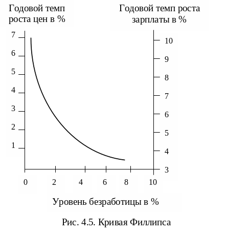 На основе эмпирических данных за определенный период времени, была выявлена обратная зависимость уровней инфляции и безработицы. Графическое отражение, называемое кривой Филлипса см.: на рис. 4.5.