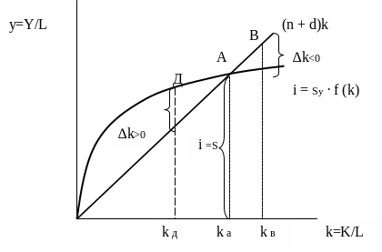 Начертите и объясните сущность кривых и условия равновесия на графике, отражающем модель Солоу.