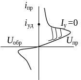 На управляющий электрод подается положительный потенциал относительно катода. Это четырехсложный прибор обладает двумя устойчивыми состояниями. При отсутствии тока управления тиристор ведет себя как очень большое сопротивление. При наличии тока управления – как очень малое сопротивление. Перевод во включенное состояние осуществляется внешним воздействием. После прохождения переменного тока через нуль тиристор восстанавливает свои вентильные свойства, цепь тока обрывается. |