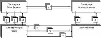 1. Представление заявления на открытие аккредитива. 2. Открытие аккредитива банком-эмитентом и направление аккредитива бенефициару через авизующий банк. 3. Извещение (авизование) бенефициара об открытии аккредитива в его пользу. 4. Отгрузка товара на экспорт. 5. Оформление и представление бенефициаром в банк комплекта документов для получения платежа по аккредитиву. 6. Пересылка авизующим банком документов банку-эмитенту. 7. Проверка банком-эмитентом полученных документов и их оплата. 8. Выдача банком-эмитентом оплаченных документов приказодателю аккредетива. 9. Зачисление авизующим банком экспортной выручки экспортеру.