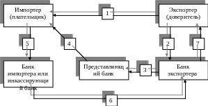 1. Экспортер заключает контракт с импортером о продаже товаров на условиях расчетов по документарному инкассо и отправляет ему товар. 2. Экспортер направляет своему банку инкассовое поручение и коммерческие документы. 3. Банк экспортера направляет инкассовое поручение и коммерческие документы представляющему банку (или банку импортера). 4. Представляющий банк предъявляет эти документы импортеру. 5. Импортер производит оплату документов инкассирующему (или своему) банку. 6. Инкассирующий банк переводит платеж банку-ремитенту (или банку экспортера). 7. Банк-ремитент зачисляет переведенную сумму на счет экспортера.