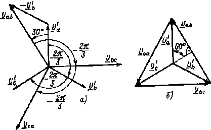 На основании уравнений по второму закону Кирхгофа для контуров N1abN1, N1bсN1и N1caN1(см. рис. 3.3) нетрудно получить следующие уравнения, связывающие линейные и фазные напряжения: