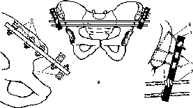 - •121. Остеосинтез латерального мыщелка большеберцовой кости конструкцией ао (а) и наружный остеосинтез переломов мыщелков большеберцовой кости (б — г).