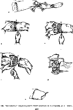 - •Транспортная (а) и лечебная (б, в) иммобилизация при диафизарных переломах бедренной кости.
