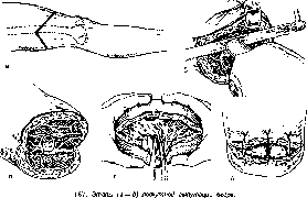 Костно-пластическая ампутация голени по н.ИЛирогову (а — г), фасциопластический метод ампутации голени по в.Д жаклину (д — ж).