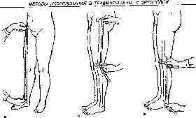 - •Транспортная (а) и лечебная (б, в) иммобилизация при диафизарных переломах бедренной кости.