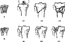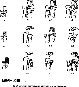 - •118. Переломы мыщелков большеберцовой кости, а — латерального; б — обоих.