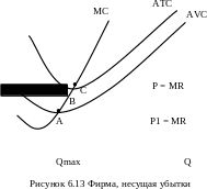 – продолжает работать, но потерпит убытки, если P=MR>AVC, т.е. ATC>Р>AVC (рис.6.13, т.В);