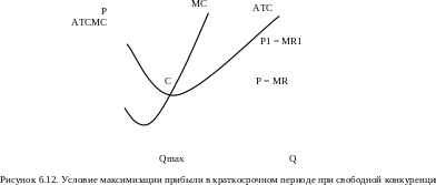 Таким образом, прибыль достигает максимального значения при условии, что предельный доход, равный цене (Р=МR), равен предельным издержкам производства. Графически это условие отражено на рисунке 6.12. точкой С пересечения графика МС и линии Р=МR, касательной к графику АТС.