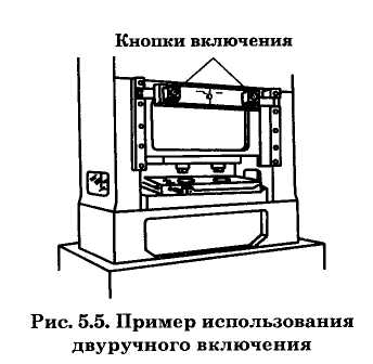 Двуручное включение требует синхронного нажатия обеих кнопок для запуска рабочего цикла машины, после чего руки свободны. Кнопки пуска должны располагаться достаточно далеко от опасной зоны, чтобы рабочий не успел переместить руки от кнопок в опасную зону до того, как будет завершена опасная часть технологической операции (рис. 5.5).