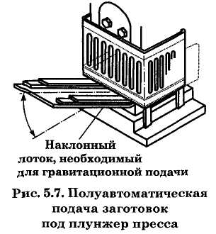 Качающийся лоточный транспортер (рис. 5.8) проходит под обработанную заготовку, когда салазки идут в верхнее положение. Челночный механизм забирает заготовку, снятую с салазок, и направляет ее в поток. Когда плунжер пресса двигается вниз, по направлению к следующей заготовке, челнок уходит из-под пресса.