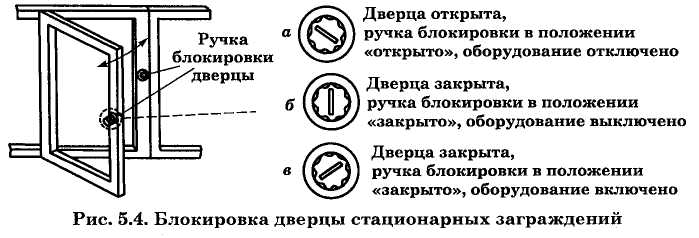 Вход обслуживающего персонала в огражденную зону осуществляется через дверцы, снабженные устройствами блокировки, останавливающими работу оборудования при их открытии (рис. 5.4).