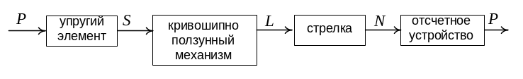 Из данной схемы видно, что поступающий сигнал измерительной информации о давлении последовательно преобразуется в показание измерительного прибора, при этом все преобразования имеют свое строгое место и назначение в измерительной цепочке, целью которых является получение информации об измеряемом параметре в нужной форме и в нужном масштабе. Например, при необходимости получить сигнал в электрической форме, можно поставить между рычагом 3 и шкалой 4 дополнительный преобразователь перемещения в электрический сигнал в виде потенциометра.