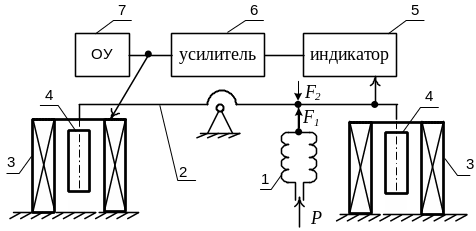 Примером может служить средство измерения давления – манометр с силовой компенсацией, схема которого показана на рисунке 2.11. Манометр состоит из чувствительного упругого элемента (сильфона) 1, тангенсного механизма (рычага) 2, силового механизма, состоящего из двух электромагнитов 3 с якорями 4, индикатора положения 5, усилителя 6 и отсчетного устройства (ОУ) 7.