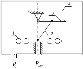 Примером средства измерения прямого преобразования может служить манометр для измерения давления, показанный на рисунке 2.8. Он состоит из мембранной коробки 1, преобразующей давление в линейное перемещение центра мембраны, кривошипно-шатунного механизма 2, преобразующего это линейное перемещение в угловое, рычага - указателя 3, который преобразует угловое перемещение кривошипа в линейное перемещение стрелки, находящейся на его конце и отсчетного устройства 4 – шкалы, проградуированной в единицах давления.