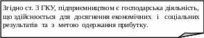 Підприємництво — це безпосередня, самостійна, систематична, на власний ризик діяльність по виробництву продукції, виконанню робіт, наданню послуг з метою одержання прибутку, яка здійснюється фізичними і юридичними особами, зареєстрованими як суб'єкти підприємницької діяльності в порядку, встановленому законодавством (ч.І ст.1 Закону «Про підприємництво»). |