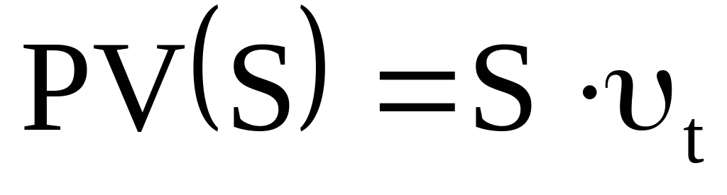 указывает на явную зависимость от времени. Здесь, конечно, нет никакого противоречия, поскольку текущее значение вычисляется для суммы S, относящейся к моменту t в будущем, т.е., строго говоря, нужно писать St и тогда Р — есть текущее значение этой суммы, а приведенная выше формула показывает, как вычисляется текущее значение для любой суммы, отнесенной к любому моменту времени. В англоязычной финансовой литературе употребляется специальное обозначение — РV (сокращение от present value). Используя это обозначение, текущее значение суммы St можно обозначить как PV(St), и тогда формула для текущего значения примет вид