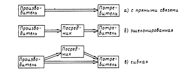 Гибкие логистические системы. Здесь движение материального потока от производителя продукции к ее потребителю может осуществляться как напрямую, так и через посредников (рис. 20 в).