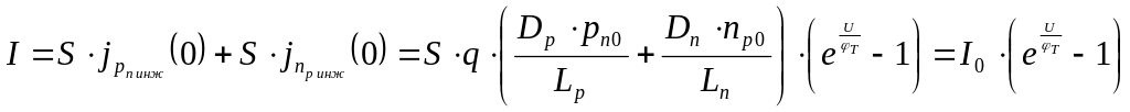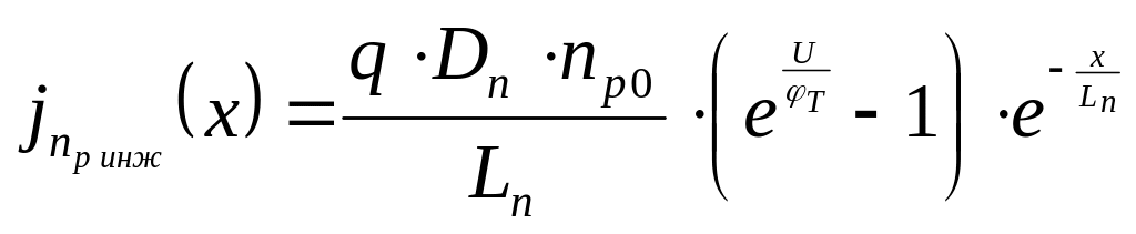 Уменьшение инжектированного тока с расстоянием является следствием рекомбинации неравновесных неосновных носителей по мере диффузии их от перехода. Исчезновение основных носителей за счет рекомбинации их с неравновесными неосновными носителями восполняется внешним источником через контакты к р- и n- областям. Составляющая тока основных носителей, идущих на рекомбинацию, называется рекомбинационным током Рекомбинационный ток изменяется обратно инжектированному. Кроме этих двух составляющих тока, в каждой из областей протекают постоянные токи основных носителей, которые идут на инжекцию в противоположные области. Сумма всех этих токов и определяет полный ток через p-n - переход. На границе перехода ( , рис. 2.8) полный ток имеет только две составляющие: инжектированный ток электронов и дырок. Следовательно, умножая плотность тока в этом месте на площадь перехода S, получим уравнение ВАХ p—n - перехода в виде