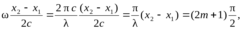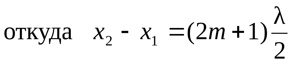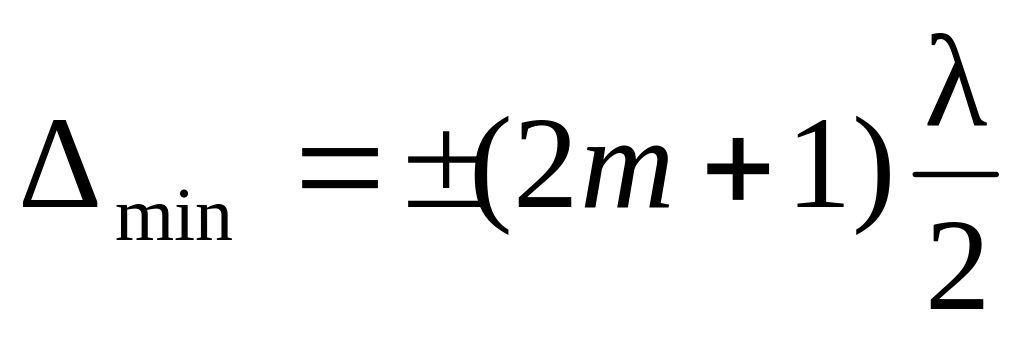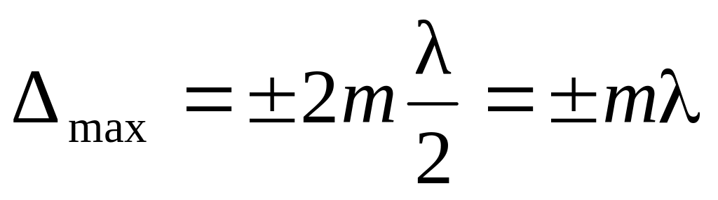 Если вместо Δ подставить значения Δmax и Δ min, то мы получим условия максимума и минимума интерференции для разности фаз δ max = ±2πm и δ min = ±(2m+1)π, ( m = 0,1,2…).