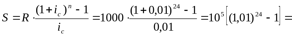 Пример: Вкладчик в конце каждого месяца вкладывает в банк 1000 руб. Проценты начисляются ежемесячно по номинальной годовой ставке сложных процентов, составляющей 12%. Определить наращенную сумму на счете вкладчика через 2 года.