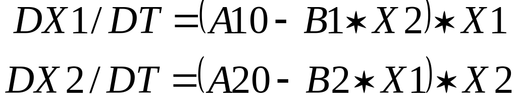 Здесь жертва (XN) размножается со скоростью А1, но поедается со скоростью (–B1YS) и наоборот, хищник (YN) сам вымирает (A2) и стимулируется пищей (В2XS). Программа, реализующая систему (10) на экране монитора имеет вид (с учетом замечаний в Приложении 1):