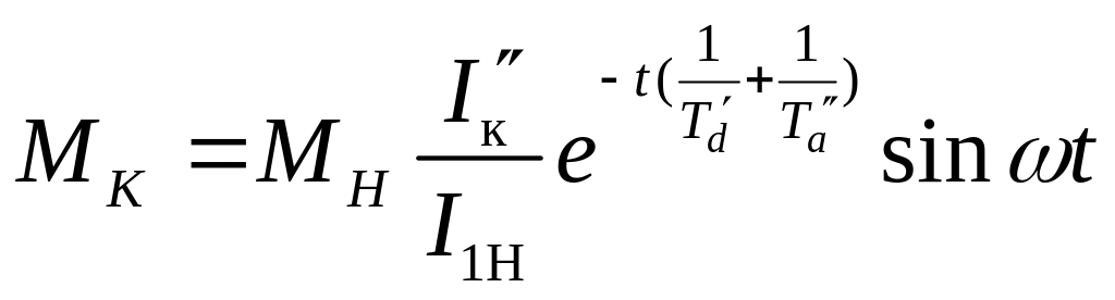 Периодическая составляющая тока короткого замыкания практически чисто реактивная и в образовании электромагнитного момента не участвует. Момент создается взаимодействием апериодической составляющей тока короткого замыкания статора с полем ротора. Момент знакопеременный, так как полюса ротора перемещаются относительно неподвижной намагничивающей силы, созданной апериодическими составляющими. Поле ротора затухает с постоянной времени T'd, апериодическая составляющая тока короткого замыкания — с постоянной времени Т"а (T'а). Значение момента в переходном процессе, полагая, что он изменяется по гармоническому закону, равно