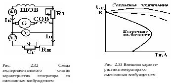 Нагрузочная характеристика идет выше,а регулировочная - ниже, чем у генератора с параллельным возбуждением, при согласном включении обмоток, что связано с компенсацией реакции якоря обмоткой последовательного возбуждения.