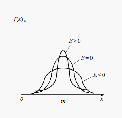 На рис. 3 приведены примеры кривых распределения с различными значениями эксцесса. Для нормального распределения Е = 0. Кривые, более островершинные, чем нормальная, имеют положительный эксцесс, более плосковершинные – отрицательный.