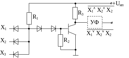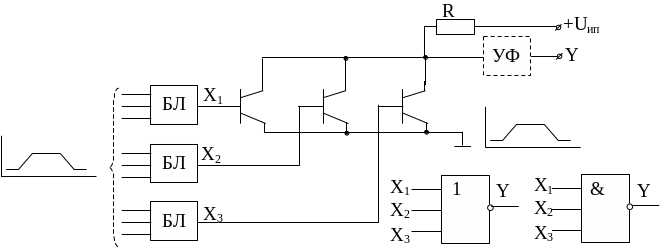 При отрицательной логике, т. е. верхний уровень “0”, а нижний “1” схема реализует функцию И-НЕ для аргументов Х1-Х3, или функцию ИЛИ для инверсных сигналов на выходах транзисторов.