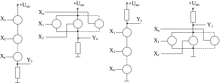 Ниже приведены два варианта реализации логических функций для обобщенных схем, работающих на общую нагрузку, подсоединенную к источнику питания Uпит . При этом тип транзистора и полярность источников питания не имеют значения.