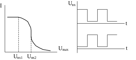 Усиление (усиление по мощности). Допустим, сигнал на входе инвертора отсутствует транзистор закрыт и Uвых=Uk =Uпит.. При подаче сигнала на вход транзистор из режима отсечки переходит в режим насыщения.