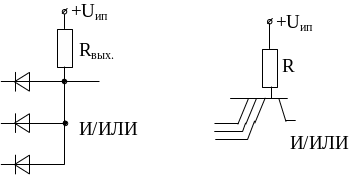 Точно такие же функции в зависимости от положительной или отрицательной логики выполняются на коллекторном выходе многоэмиттерного транзистора, у которого переходы база-эмиттер выполняют функцию диодов.