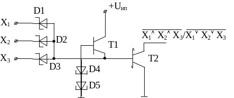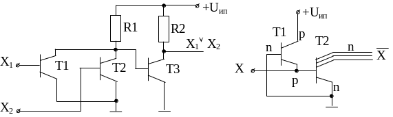 Диоды Шоттки (ДШ) используются также на входах схемы для гашения колебаний и исключения появления отрицательных напряжений на входе элементов. ДШ можно включить к обычным транзисторам. Эти две схемы функционально не отличаются.