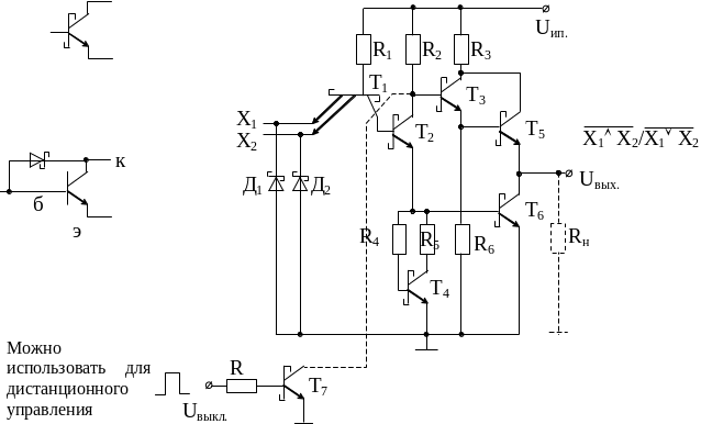 Элементы типа ТТЛ допускают режим работы с тремя состояниями (1, 0, выключено). В режиме “выкл” (режим отсечки) оба выходных транзистора Т5, Т6 находятся в выключенном состоянии благодаря Т7. Положительный потенциал на его входе выключает схему, позволяя использовать ее для построения системных магистралей, объединяющих выходы ряда устройств.