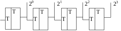 Увеличивая количество Т-триггеров можно образовать счетчик (двоичный) на Т-триггерах.