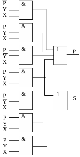 При разработке функциональной схемы соединение выходов конъюнктора к дизъюнктору определяется из таблицы истинности и согласно характеристическим уравнениям Si и Pi+1. При этом единица означает, что на вход N должны подать для канала Si и Pi+1. Именно те сигналы, где выход равен 1. Например: