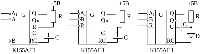 В настоящее время разработано множество формирователей на ИС. Например, на ИС серии 155 разработаны формирователи К155АГ1 и К155АГ3. В одном корпусе К155АГ3 соединяются два одновибратора.