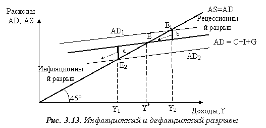Отсутствие равновесия между реальным и потенциальным уровнем выпуска может привести экономику к двум отрицательным для нее эффектам: инфляционному разрыву и рецессионному (дефляционному) разрыву.