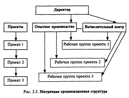 По вертикали строится управление по отдельным сферам деятельности организации, по горизонтали осуществляется управление проектами. Для матричной структуры (рис. 2.3) характерны создание связей между специалистами, организация работ по определенным задачам, вне зависимости от позиции в организации, включенности в конкретное подразделение.