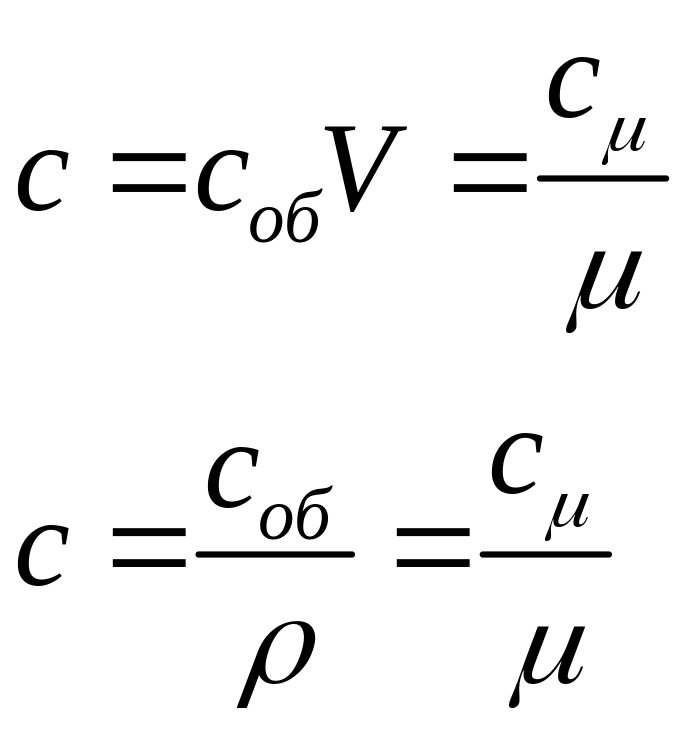 Так как количество вещества может быть задано в массовых, объёмных или мольных единицах, различают средние массовую С(кДж/кг*град), объемную Соб(кДж/м3*град), и мольную Сµ(кДж/Кмоль*град) теплоёмкость.